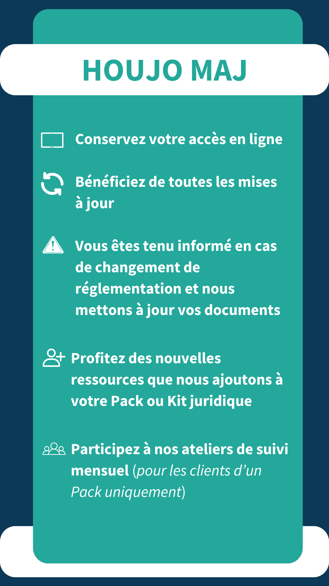 En revanche, si vous avez des questions sur un changement de réglementation ou une ressource comprise dans votre Pack/Kit, vous pouvez nous contacter à bonjour@houjo.fr ou nous poser vos questions lors d'un atelier mensuel (pour les clients d'un Pack uniquement).